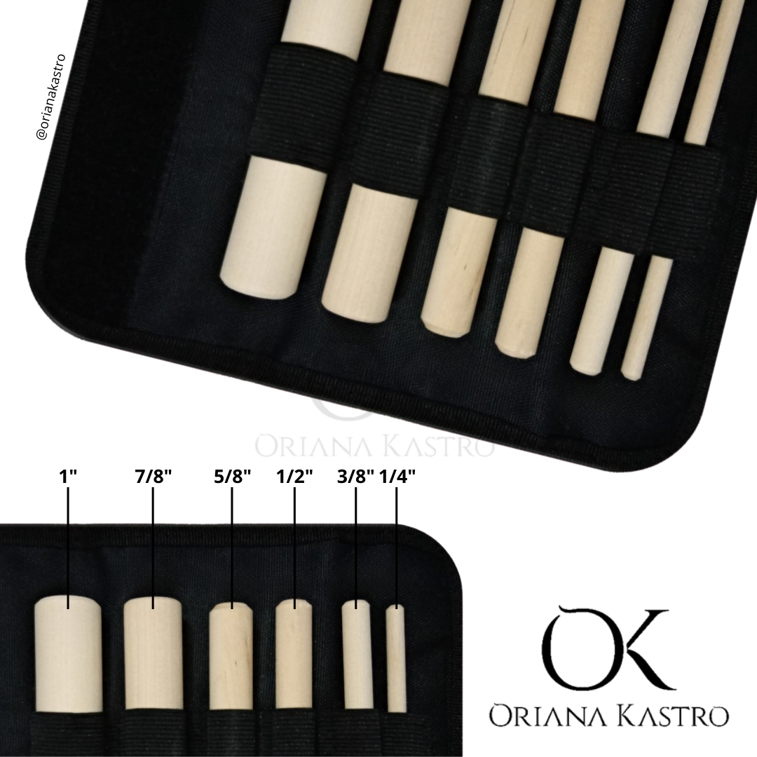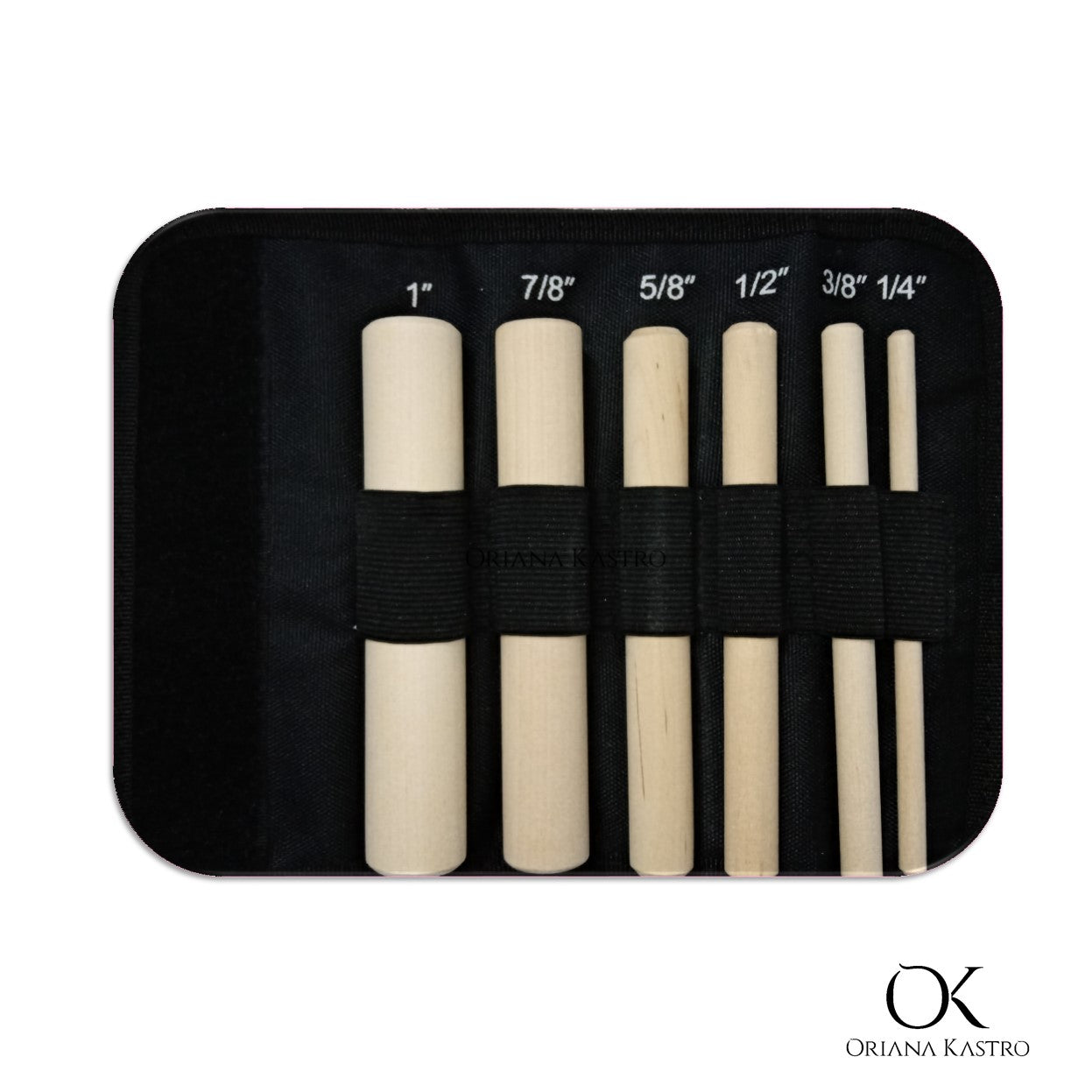 O conjunto inclui: 6 mandris redondos de madeira em uma caixa de armazenamento compacta e etiquetada. Os diâmetros do mandril variam de 1/4" a 1" (6,4-25,4 mm)